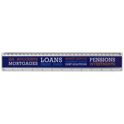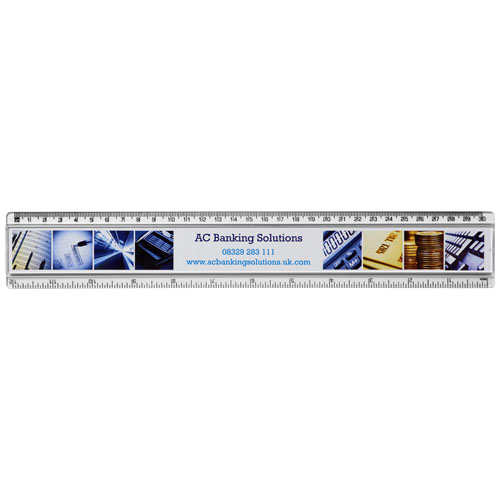 Righello in plastica con inserto in carta con marcature in pollici e centimetri.