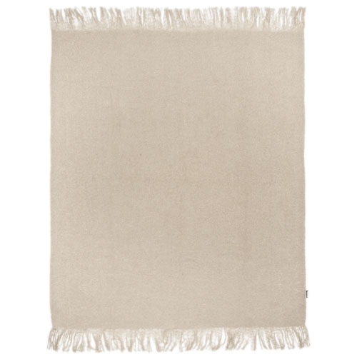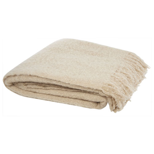 Morbidissima coperta in RPET certificato GRS, avvolta con un nastro RPET 190T. Confezionata in un sacchetto in plastica riciclata. Lunghezza delle frange: 10 cm su ogni lato. Dimensione del nastro: 72 cm x 4 cm.