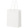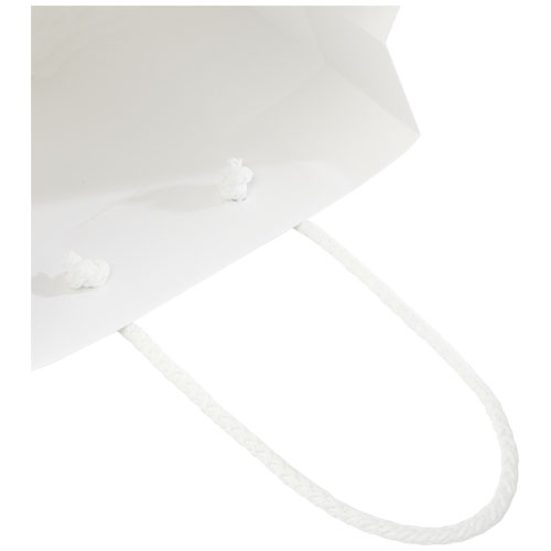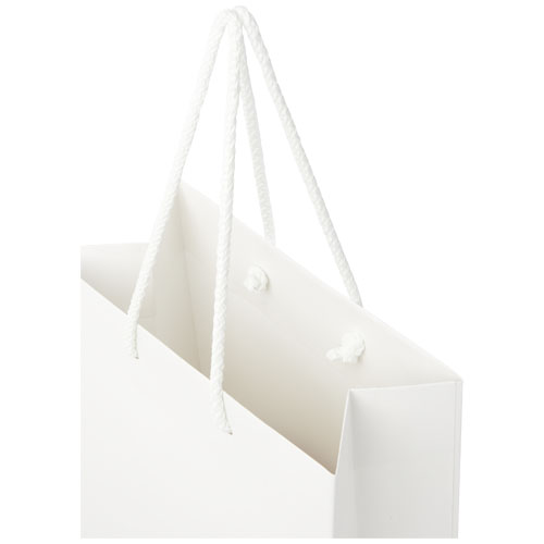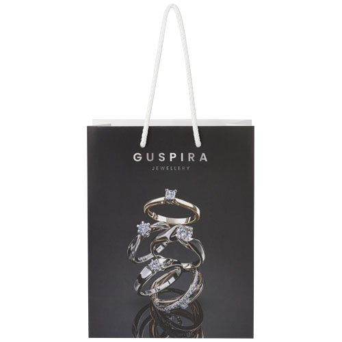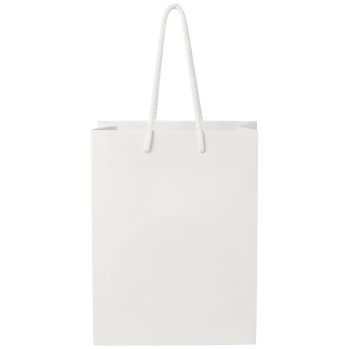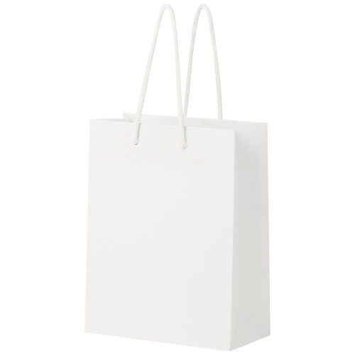Sacchetto medio di carta integra da 170 g/m² opaca (18 x 9 x 23 cm) realizzato a mano con manici di plastica. La parte anteriore e posteriore personalizzabili offrono un ampio spazio per stampare un logo o qualsiasi altro design, rendendolo un ottimo strumento di marketing aziendale. Realizzata in Europa e riciclabile al 100%.