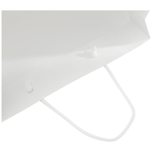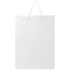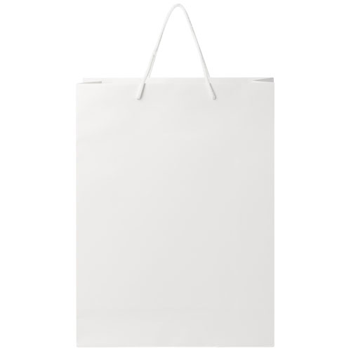 Sacchetto extra large di carta integra da 170 g/m² opaca (31 x 12 x 41 cm) realizzato a mano con manici di plastica. La parte anteriore e posteriore personalizzabili offrono un ampio spazio per stampare un logo o qualsiasi altro design, rendendolo un ottimo strumento di marketing aziendale. Realizzata in Europa e riciclabile al 100%.