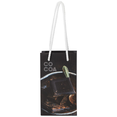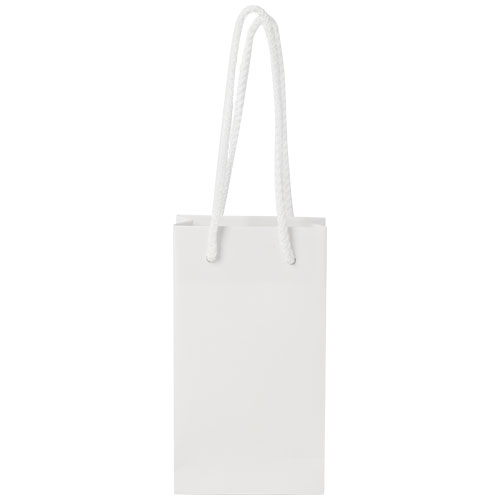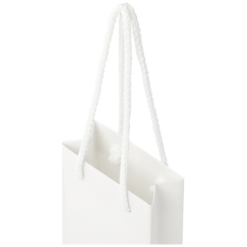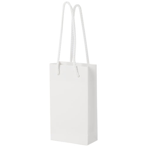 Sacchetto piccolo di carta integra da 170 g/m² opaca (9,5 x 4 x 17 cm) realizzato a mano con manici di plastica. La parte anteriore e posteriore personalizzabili offrono un ampio spazio per stampare un logo o qualsiasi altro design, rendendolo un ottimo strumento di marketing aziendale. Realizzata in Europa e riciclabile al 100%.