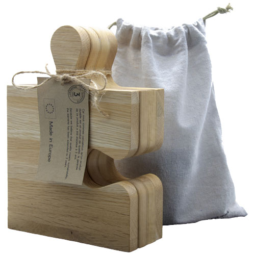Set di 4 pezzi in legno di rovere che formano un puzzle una volta assemblati (30 x 30 x 1,5 cm). Consegnato in una custodia in cotone riciclato (27 x 22 cm).