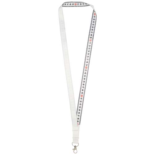 Lanyard da 1 metro con sublimazione full color in PET riciclato. Questo cordino è stampato a colori su un lato, mentre sul retro è presente la stampa di un metro a nastro. Il cordino presenta un gancio metallico e può contenere un badge, la carta d’identità o le chiavi.
