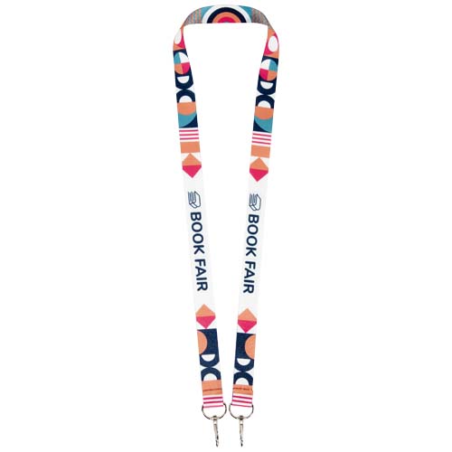 Cordino con stampa in sublimazione full color in PET riciclato e 2 ganci in metallo. Può contenere badge, carte d’identità o chiavi. Disponibile in 4 diverse larghezze: 10, 15, 20 e 25 mm.