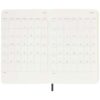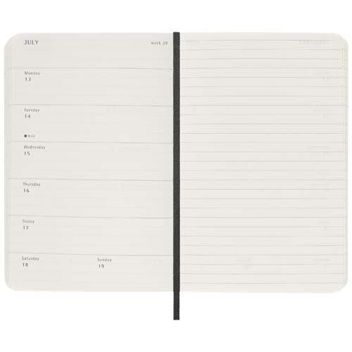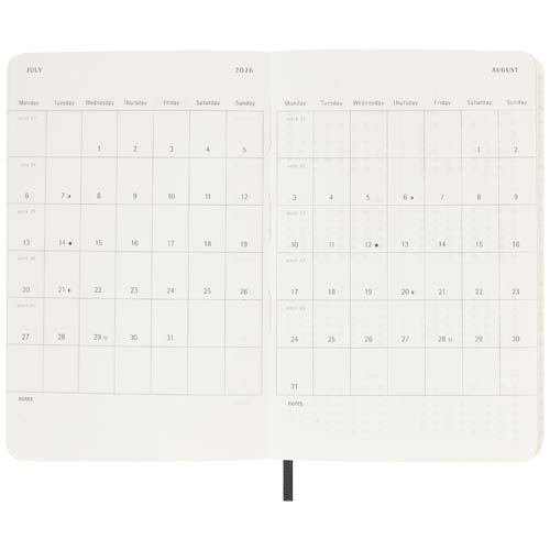 Con durata gennaio-dicembre 2026, l’agenda settimanale 12 mesi tascabile Moleskine con copertina morbida mostra l’intera settimana a colpo d’occhio, oltre a pagine con panoramica annuale e mensile per una visione più ampia dell’anno, seguite da pagine per la pianificazione di viaggi, idee e obiettivi. I giorni di ogni settimana sono indicati su un lato, mentre a destra è presente una pagina a righe per impegni e appunti. Dispone di una carta priva di acidi color avorio, una chiusura con elastico nero, un segnalibro a nastro, una tasca interna espandibile in colore coordinato, adesivi per la personalizzazione e adesivi dell’anno per il dorso.