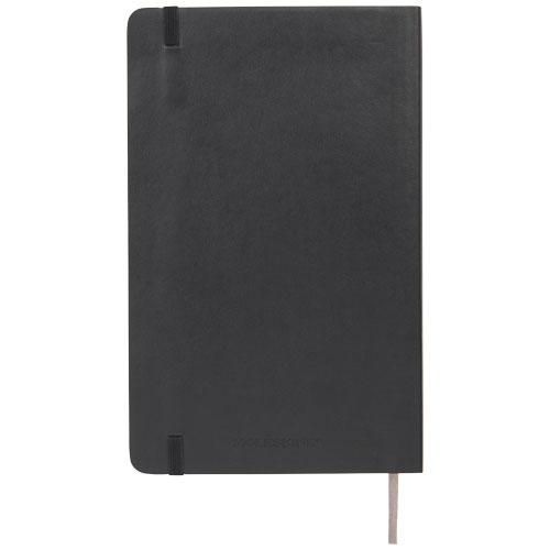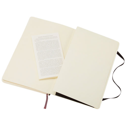 Il blocco note con copertina morbida Moleskine Classic L (13×21 cm) è disponibile in una vasta gamma di colori vivaci alla moda. Questo blocco note presenta una copertina morbida in cartoncino con angoli arrotondati, carta priva di acidi, un segnalibro e una chiusura con elastico. Sulla prima pagina è presente una nota in cui scrivere la ricompensa per chi ritrova il blocco note in caso di smarrimento. Fissata alla copertina posteriore si trova una tasca interna espandibile che contiene la storia di Moleskine. Questa tasca può essere utilizzata per contenere fogli sparsi e appunti. Contiene 192 pagine a righe color avorio.