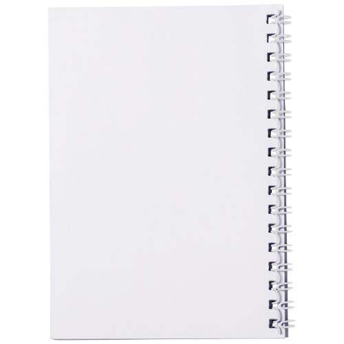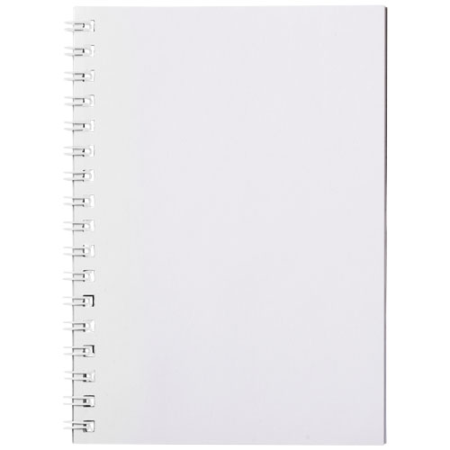 Blocco note spiralato di formato A6 Desk-Mate®. Include 50 fogli di carta bianca da 80 g/m2, una copertina frontale in carta lucida (250 g/m²) ed una sovra copertina da 450 micron in polipropilene trasparente. Spirale nera o bianca. Puoi personalizzare le pagine di questo versatile blocco note con qualsiasi design – sia che tu voglia fogli a righe, a quadretti o puntinati – tutto è possibile!