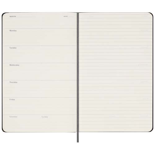 L’agenda settimanale con copertina rigida e senza data Moleskine puoi iniziare a utilizzarla in qualsiasi momento dell’anno. È una scelta eccellente per chi cerca uno strumento di pianificazione flessibile e duraturo. Gli spazi per mesi, settimane e date sono lasciati vuoti per una maggiore flessibilità e libertà rispetto a un’agenda con data. Inserendo da soli le date, si possono evitare gli spazi vuoti e utilizzare solo le pagine necessarie. Dispone di 12 divisori personalizzabili per i mesi, cinque settimane senza data per mese, una chiusura con elastico e un segnalibro abbinato, carta color avorio senza acidi da 70 g/m2 e una tasca interna espandibile.