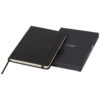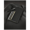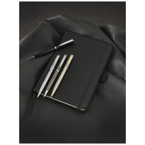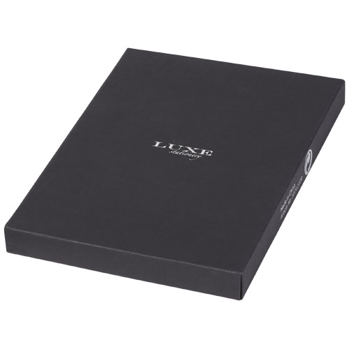 Taccuino con design esclusivo (formato A5) caratterizzato dalla carta da 80 g/m², 80 fogli a righe di color crema con tasca posteriore interna e porta penna. Confezionata in una scatola regalo “LUXE”.