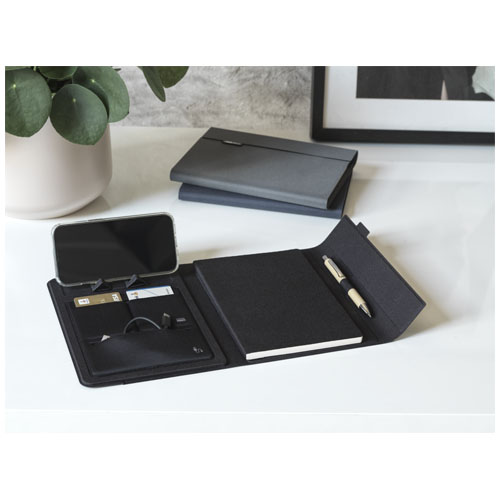Il portadocumenti con blocco per appunti Liberto è realizzato in parte con poliestere riciclato post-consumo certificato RCS, che lo rende una scelta più sostenibile in quanto contribuisce a ridurre l’uso di materie prime vergini. Con passante per penna, tasca a soffietto e 64 fogli a righe color crema in carta riciclata da 80 g/m² proveniente da fonti sostenibili. La penna e gli altri accessori che appaiono nelle foto non sono inclusi in questo articolo.