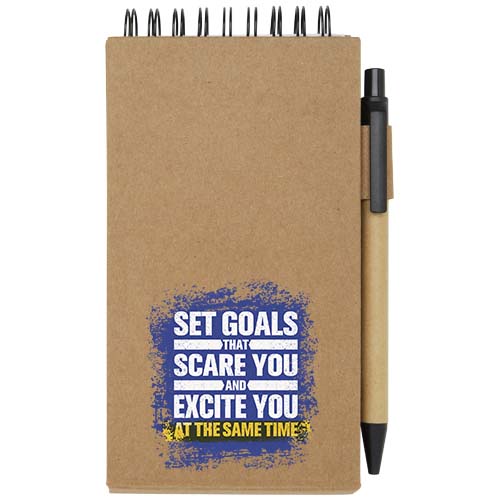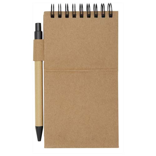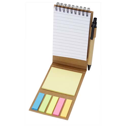 Blocchetto con foglietti adesivi e penna a sfera. Il blocchetto è dotato di 30 fogli di carta bianca da 70 g/m² (8 x 12 cm). Dispone inoltre di 25 foglietti adesivi multicolore (5 x 1,2 cm) e 25 gialli (7,5 x 7,5 cm), entrambi in carta da 70 g/m². Il fusto della penna a sfera è realizzato in carta riciclata. Colore dell’inchiostro: Nero. Capacità di scrittura: 1000 metri. Dimensione del pennino: 1,00 mm.