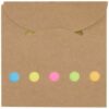 Il blocchetto Freijo presenta 125 foglietti adesivi piccoli (5 x 1,5 cm) in 5 colori diversi e 25 foglietti adesivi grandi (7,5 x 7,5 cm) di colore giallo.