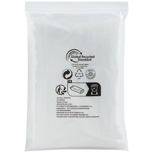 Il poncho impermeabile monouso taglia unica Mayan è realizzato in plastica certificata GRS al 100%. Questo poncho trasparente con cappuccio è ideale da avere a portata di mano in caso di temporali durante un festival o qualsiasi altro evento all’aperto. Fornito all’interno di una custodia adatta alla stampa. Dimensione: 90 x 120 cm.