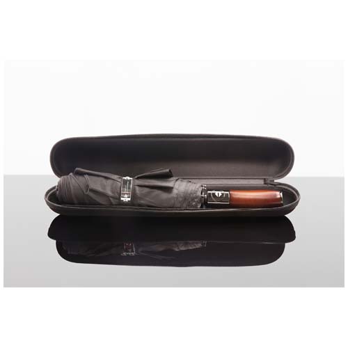 Ombrello pieghevole ad apertura/chiusura automatica che combina un artigianato classico alla durata moderna. Realizzato in tessuto pongee 210T in PET riciclato idrorepellente, presenta una robusta asta in legno e stecche flessibili in fibra di vetro per una maggiore resistenza al vento. Il pulsante integrato consente un’apertura e una chiusura rapida e semplice. Dispone anche di una custodia in EVA resistente all’acqua e include una custodia per ombrello abbinata. La personalizzazione è disponibile sulla piastra in metallo del pulsante di chiusura. Fornito in una confezione regalo cilindrica, realizzata in carta riciclata.