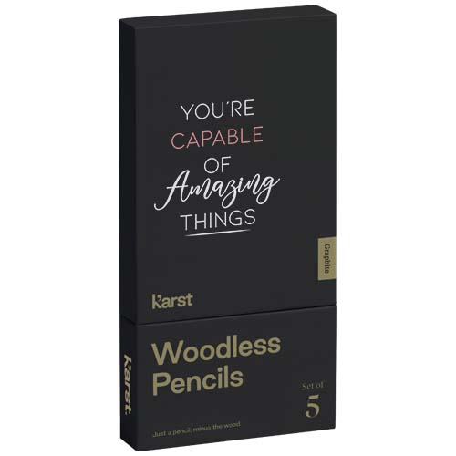 Set di 5 matite in grafite che offrono una durata 5 volte superiore. Il fusto privo di legno può essere temperato per scrivere linee nitide, oppure spuntato per realizzare tratti più espressivi o sfumature leggere. La struttura priva di legno consente un utilizzo versatile senza la produzione di scarti. La solidità di queste matite offre una sensazione piacevole quando si tengono in mano per scrivere o per disegnare a mano libera.
