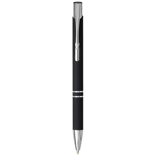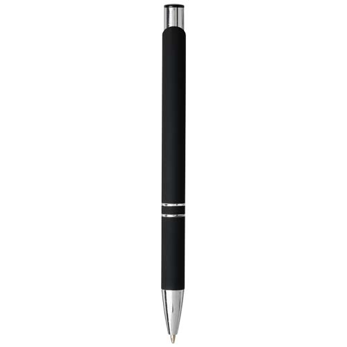 Il rivestimento in gomma rende la penna morbida al tatto, e una volta che viene incisa al laser diventa visibile lo strato inferiore argentato della penna. Penna a sfera con meccanismo a scatto, rivestimento in gomma nera, finiture cromate e parte superiore in ABS nero. L’ampia e popolare gamma Moneta è disponibile in diversi stili e finiture.