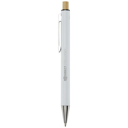 La penna a sfera Cyrus è realizzata in alluminio riciclato, che richiede meno energia nella produzione rispetto all’alluminio proveniente da materie prime. Riduce inoltre la quantità di rifiuti nelle discariche e aiuta a conservare le risorse naturali con l’obiettivo di ridurre le emissioni di gas serra. Il pulsante è realizzato in bambù. Colore dell’inchiostro: Blu. Capacità di scrittura: 800 metri. Dimensione del pennino: 1,00 mm.