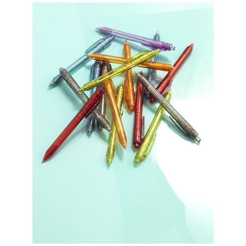 Penna a sfera con meccanismo a scatto e serbatoio trasparente. Il serbatoio è costituito da bottiglie d’acqua riciclate, pertanto contribuisce a ridurre la quantità di rifiuti plastici.