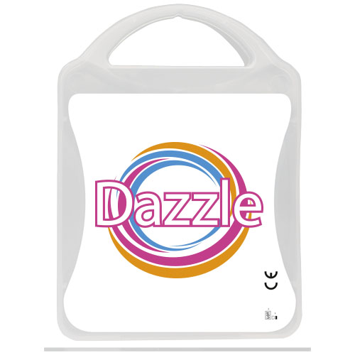 Il kit di primo soccorso ideale per ogni evento. Grazie al contenuto, sarete preparati per ogni piccolo incidente. Contenuto: 12 cerotti resistenti all’acqua, 4 salviettine disinfettanti, 2 garze sterili, 2 salviettine rinfrescanti, 2 preservativi, 2 cerotti per vesciche, 1 crema all’aloe vera, 2 tappi per orecchie. Tutti i prodotti contenuti nei MyKit rispettano le norme Europee vigenti. I prezzi includono stampa all-over fronte e retro.