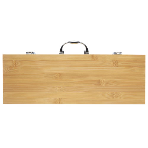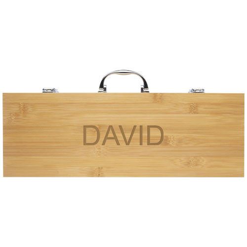 Set da barbecue in bambù composto da 5 pezzi: spatola (40 x 9,5 cm), pinza (34,5 x 6 cm), forchettone (38,5 x 3 cm), coltello (38,5 x 3 cm) e spazzola (38 x 4,3 cm). Il set viene consegnato in una confezione regalo in bambù (46 x 16,2 x 7,4 cm). I manici e la confezione regalo sono realizzati in bambù ottenuto e prodotto in base a standard ecosostenibili.