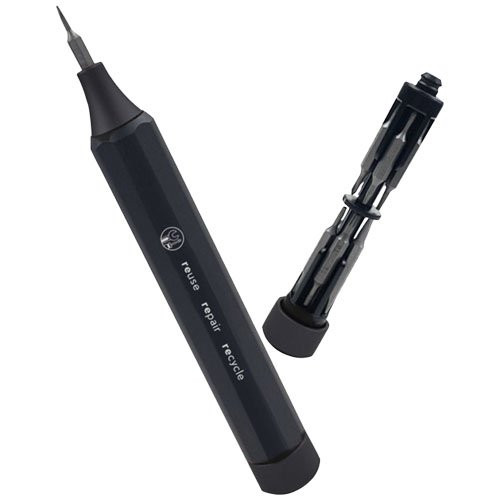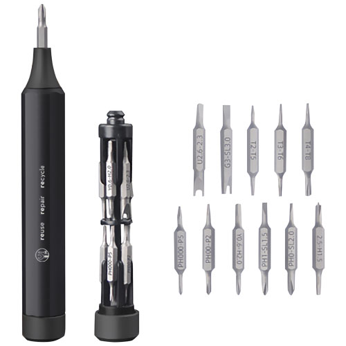 Set di cacciaviti di precisione in alluminio, dotati di 10 punte a doppia testa nascoste al suo interno. Le diverse punte si attaccano al corpo del cacciavite con una funzione magnetica e sono adatte per essere utilizzate per la maggior parte dei dispositivi tecnologici. Prodotto personalizzabile con incisione laser. Fornito in una confezione regalo in carta riciclata.