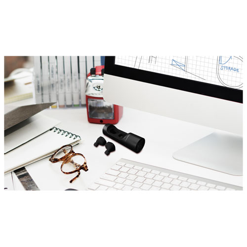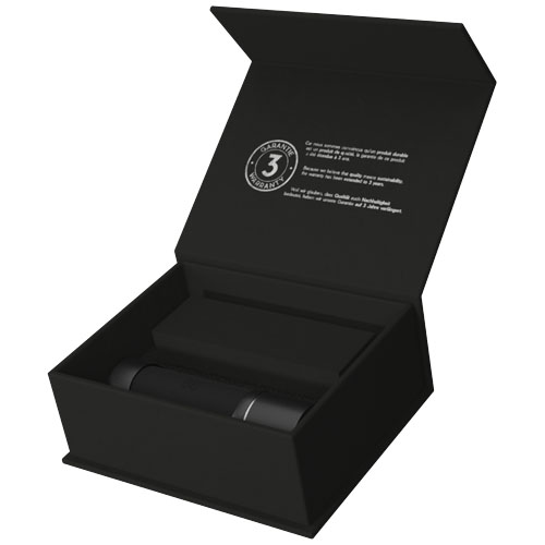 Auricolari wireless con qualità audio premium. Gli auricolari possono essere riposti e ricaricati nella base in metallo a forma cilindrica, decorabile con la stampa luminosa di un logo. La batteria nella base può ricaricare gli auricolari due volte. Microfono incorporato. Bluetooth® 5.0. Tecnologia EDR (Enhanced Data Rate). Gli auricolari sono rivestiti con finitura in gomma e sottoposti a trattamento antibatterico. Includono gommini di 3 diverse dimensioni per un’esperienza di ascolto ottimale. Brevetto EUIPO EUROPA. Fornita in una confezione regalo di colore nero (10 x 6 x 3,5 cm) con chiusura magnetica. Garanzia di 3 anni inclusa.