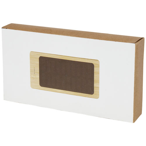 Power bank da 8000 mAh realizzato in bambù con doppia uscita USB. Grazie al pannello solare integrato per la ricarica rapida, è ideale per le attività all’aperto. Ingresso di Tipo-C da 5 V/2 A, prima uscita USB da 5 V/1 A e seconda uscita USB da 5 V/2 A. Non è fornito alcun cavo accessorio per scopi di sostenibilità. Fornito in una confezione regalo con il manuale di istruzioni (entrambi realizzati con materiali ecosostenibili).
