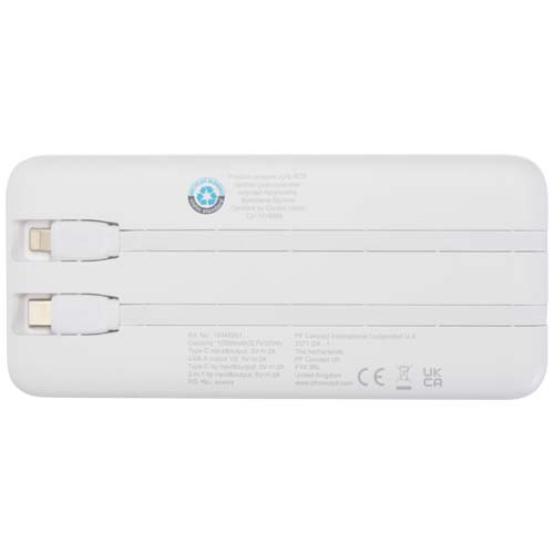 Il power bank Adhil da 10.000 mAh è realizzato in plastica riciclata e unisce stile e praticità in un design compatto. Dispone di due cavi integrati, uno di Tipo-C e uno combinato Lightning/micro-USB, oltre a due uscite USB-A e una porta di ingresso/uscita di Tipo-C per una ricarica versatile. Un indicatore LED mostra lo stato della carica, rendendolo una soluzione di ricarica affidabile durante gli spostamenti.