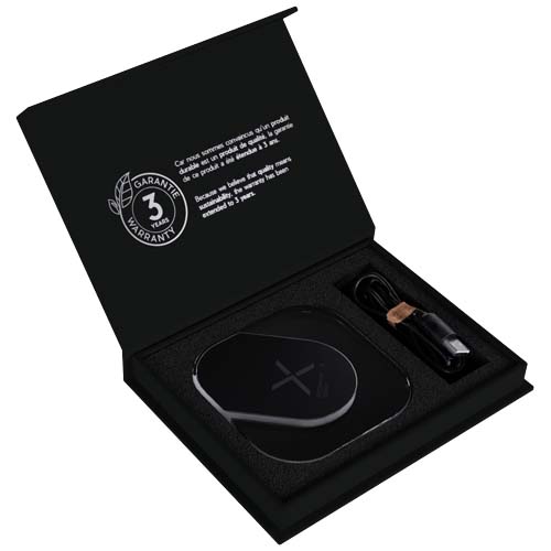 La base di ricarica wireless trasparente da 15 W presenta un LED retroilluminato che si illumina per 30-40 secondi quando la base è collegata o quando il telefono è in carica. Grazie alla tecnologia all’avanguardia, la base è in grado di fornire una potenza di ricarica wireless fino a 15 W (caricatore da parete non incluso). Consegnata con un cavo di ricarica in PET riciclato (caricatore da parete non incluso) e una confezione regalo in cartone riciclato con chiusura magnetica.