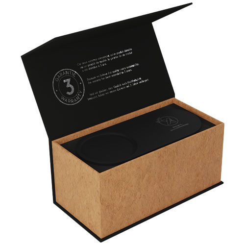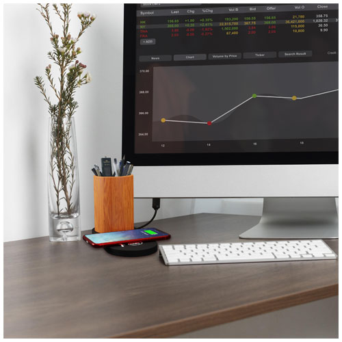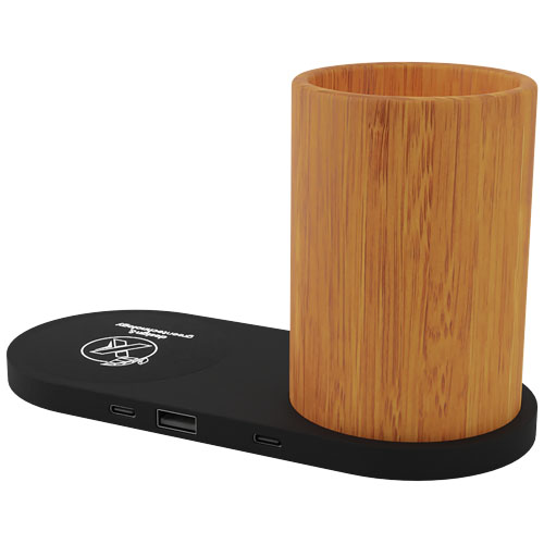 Stazione di ricarica wireless da 10 W con portamatite in bambù. La stazione di ricarica (18 x 8 x 1 cm) in materiale sottoposto a trattamento antibatterico offre una ricarica wireless da 10 W e dispone di 2 uscite USB: USB 1.0 e USB tipo C da 1 A. ciò significa che è possibile caricare fino a 3 dispositivi contemporaneamente. Il logo luminoso è applicato sulla stazione di ricarica wireless e si illumina quando viene collegato un dispositivo. Fornita con un cavo di ricarica realizzato in PET riciclato. Il portamatite (7 x 10 cm) è realizzato in bambù proveniente da fonti sostenibili, responsabili dal punto di vista ambientale e sociale. Fornito in una confezione regalo (11 x 13,1 x 5,2 cm) con chiusura magnetica. Garanzia di 3 anni inclusa.