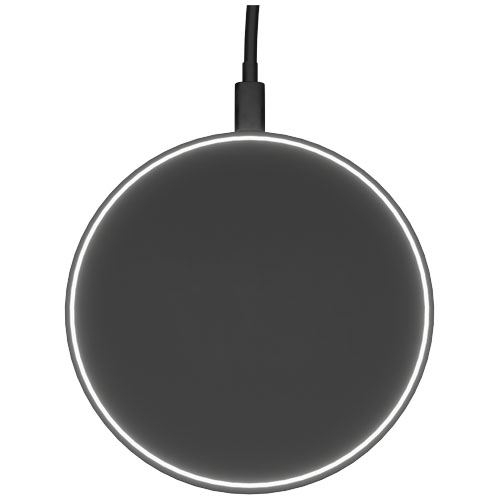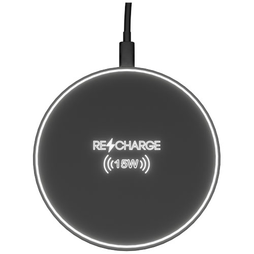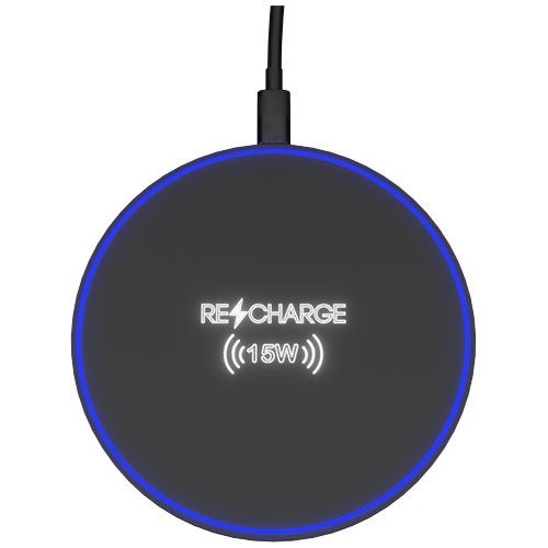 Stazione di ricarica wireless extra sottile da 15 W (10 x 7,2 cm) realizzata in plastica ABS con una finitura soft-touch. La base rotonda è adatta per l’incisione laser, che illumina il logo. Quando la stazione di ricarica è in uso, la luce sul bordo diventa bianca, mentre quando è in modalità di ricarica la luce è blu. Consegnato con un cavo di ricarica da 75 cm USB-A/Type-C realizzato in PET riciclato. Fornito in una confezione regalo (14,9 x 11,8 x 2,1 cm) con chiusura magnetica. Garanzia di 3 anni inclusa.