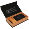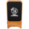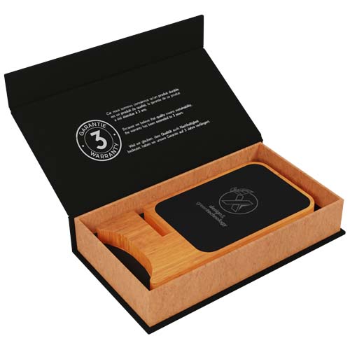 Caricabatterie wireless da 15 W realizzato in gomma e bambù con trattamento antibatterico e logo luminoso. Ingresso Tipo-C. Fornito in una confezione regalo nera realizzata in carta kraft riciclata che include un cavo in plastica PET riciclata. Brevetto EUIPO EUROPA.